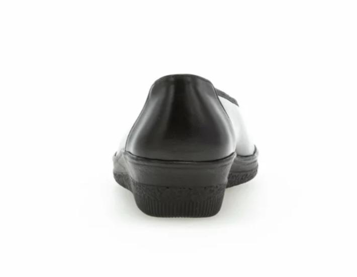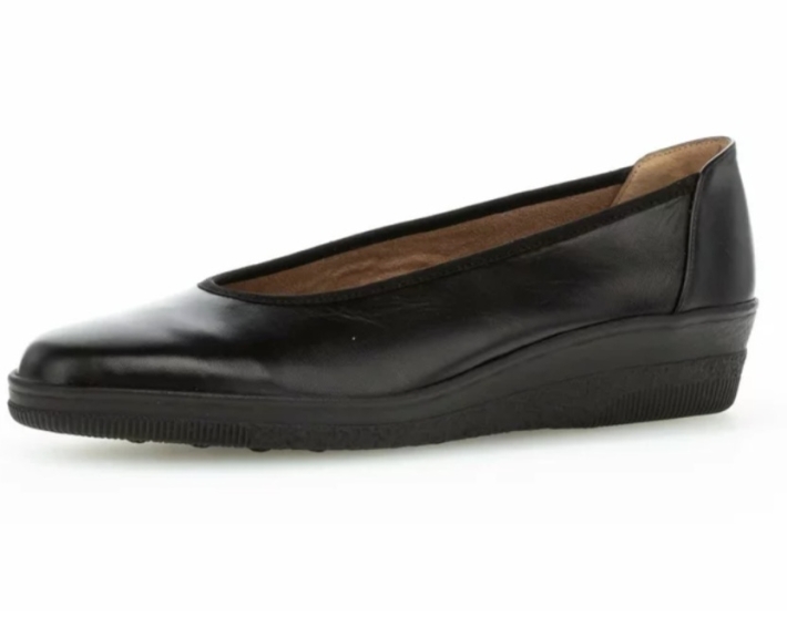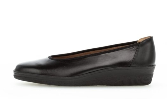 Černá hladká kůže, široká a pohodlná stélka, ideální jako náhradní obuv během letu pro palubní průvodčí.